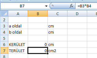 A továbbiakban ehhez hasonló módon írjuk be a téglalap területének kiszámításához (t=a*b) a cellahivatkozásokkal átalakított képletet! (=B3*B4).