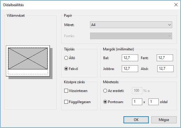 papír méretének, tájolásának és a margók szélességének beállításához az