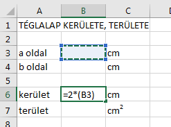 A B3 és B4 cellákba írjuk a megfelelő oldalak hosszát.