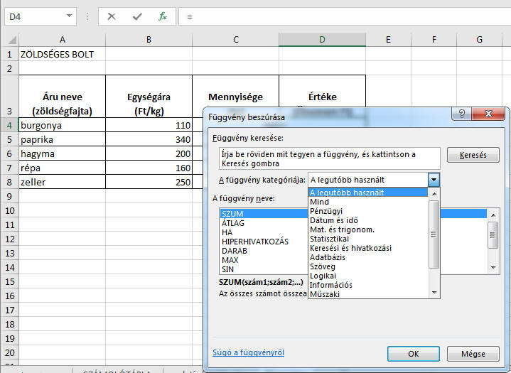 jelre kattintunk. Az ablakban kiválaszthatjuk, a függvénytípust, a