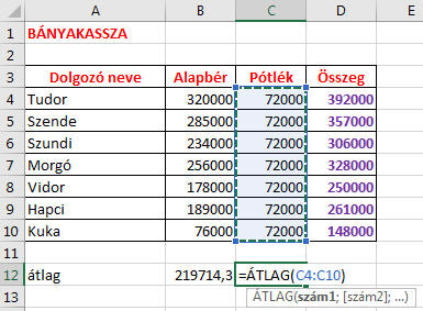 pótlékból áll, az összeget a kettő összege adja. A 12-es sor megfelelő cellájába kattintva válasszuk az AutoSzum függvény Átlag pontját! Az alapbérek átlagával nincs problémánk. A mellette levő cellába a pótlékok átlagát kell számítani. Az Excel azonban számot érzékel a közvetlenül mellette levő cellában is, és automatikusan a legközelebbi cellát jelöli be az argomentumban.