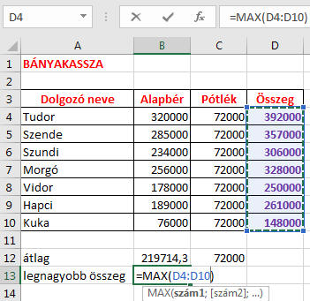 A Bányakassza táblázatunkban kerestessük ki az alapbérek maximumát és minimumát! Kattintsunk a B13, illetve a B14 cellába, válasszuk az AutoSzum menü Maximum, illetve Minimum pontját, majd egérhúzással jelöljük ki a függvény által vizsgált cellatartományt, végül üssünk ENTERt!